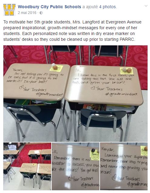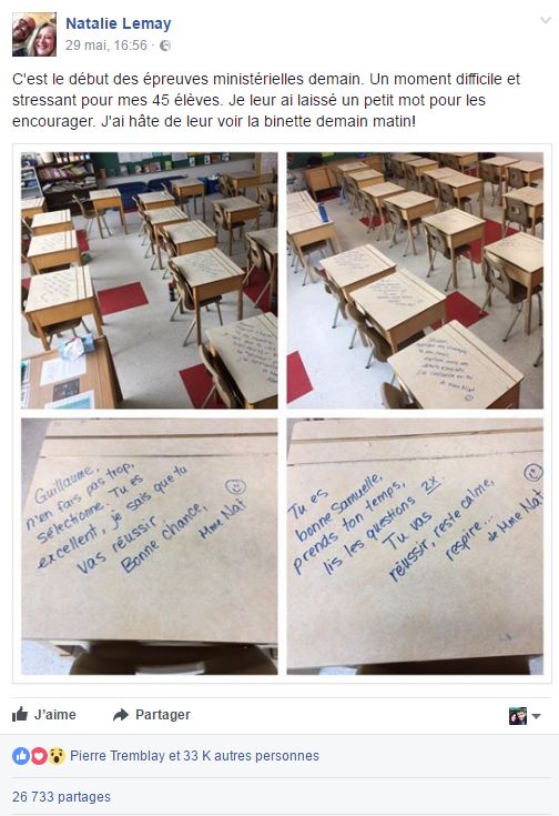 Natalie Lemay, une professeure québécoise a aussi écrit avant les examens un message d’encouragement personnalisé sur le banc de chacun de ses 45 élèves pour les motiver !