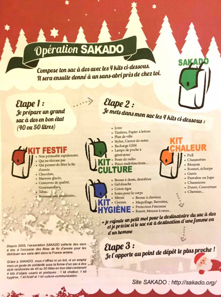 Depuis 2005, l’association SAKADO distribue aux sans-abris des sacs-à-dos à l’occasion des fêtes de fin d’année. Dans ces sacs-à-dos, on trouve :