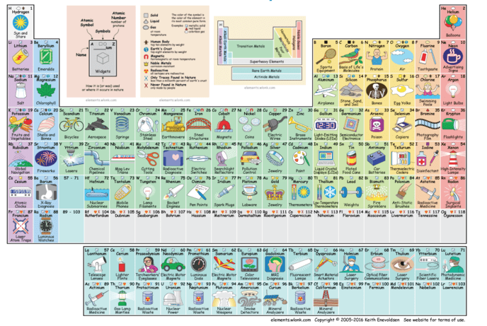 Keith Enevoldsen a réalisé une version interactive absolument géniale : chaque élément chimique est associé à son utilisation dans des objets du quotidien (des ciseaux, des lampes, de la peinture…).