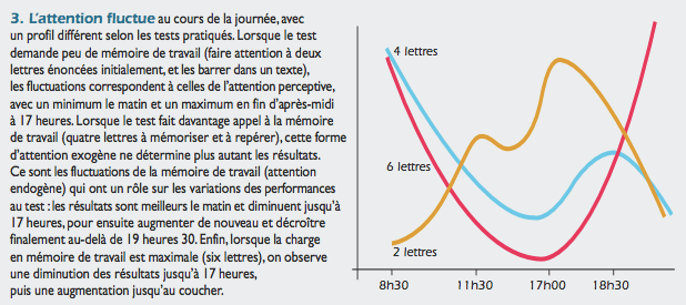 Les temps indiqués au-dessus ne sont pas figés. Au cours de la journée (et de la semaine), les capacités d’attention ne sont pas constantes : elles augmentent de façon continue du matin jusqu’en fin d’après-midi, pour décroître ensuite durant la soirée, avec cependant une forte baisse aux alentours de 13 heures. Cette courbe est proche de celle de l’évolution, au cours de la journée, de la température corporelle – un indicateur important du métabolisme.