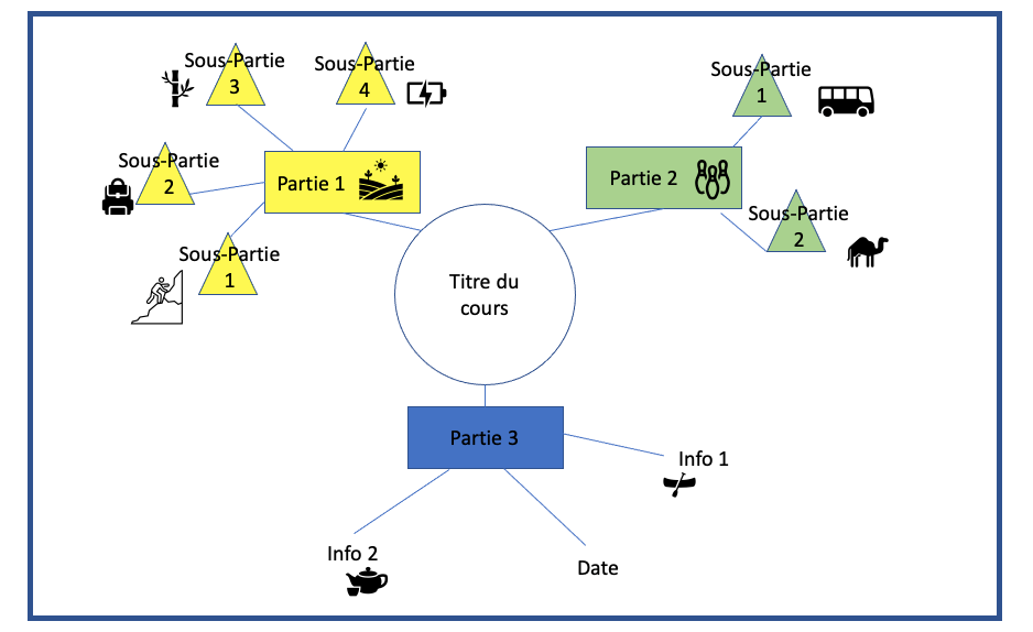 - Elle permet d’avoir une vision en une seule page des éléments importants d’un cours et de leurs articulations logiques. Je me suis aperçue que si les professeurs construisent généralement leurs cours avec des parties et des sous parties qui s’articulent de manière logique, les enfants n’ont aucune vision d’ensemble et donc perdent cette articulation logique.