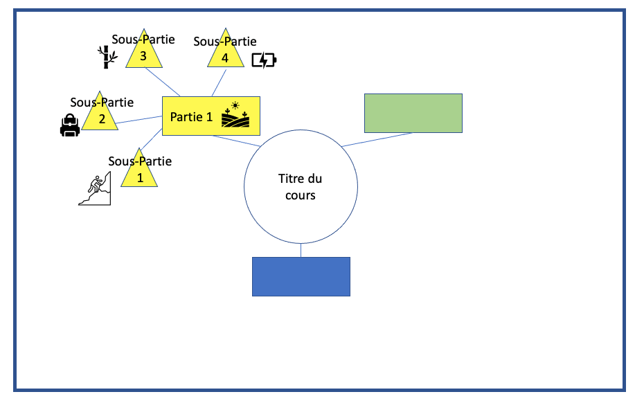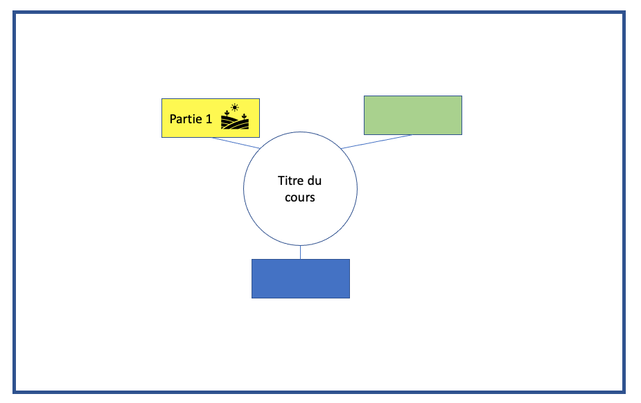 - Puis nous avons lu ensemble le contenu de la première partie de son cours. Si celle-ci était déjà répartie en sous-parties, nous recommençons le processus ci-dessus, autour du carré. Nous changeons de forme : au lieu de rectangles, nous mettons de triangles pour les sous-parties.