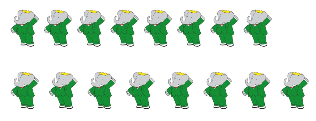 En l’occurrence, ce n’est pas juste. Il y a exactement le même nombre de Babar. Mais, sur la deuxième ligne, on a espacé un peu plus les images.